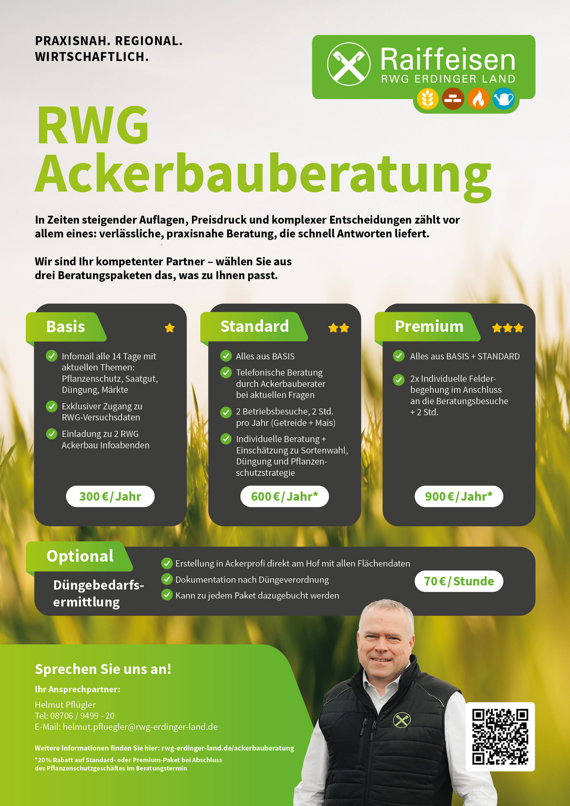 JA, ICH ERTEILE DIE EINWILLIGUNG ZUR SPEICHERUNG, VERARBEITUNG UND NUTZUNG MEINER PERSÖNLICHEN DATEN ZUR STRENG ZWECKGEBUNDENEN ABWICKLUNG DER ACKERBAUBERATUNG AN DIE RAIFFEISEN-WAREN GMBH ERDINGER LAND. EINE WEITERGABE AN DRITTE ERFOLGT NICHT. OHNE IHRE ZUSTIMMUNG ZUR DATENSPEICHERUNG IST DIE ACKERBAUBERATUNG LEIDER NICHT MÖGLICH. DIE VERARBEITUNG UND NUTZUNG IHRER DATEN FINDET DABEI GRUNDSÄTZLICH IN ÜBEREINSTIMMUNG MIT DEN DATENSCHUTZBESTIIMMUNGEN (GEMÄSS DSGVO) UND DEM TELEMEDIENGESETZ STATT. DIE ERTEILTE EINWILLIGUNG KANN JEDERZEIT WIDERRUFEN WERDEN. AUSSERDEM ERHALTEN SIE JEDERZEIT AUSKUNFT ÜBER DIE BEI UNS GESPEICHERTEN DATEN. BITTE WENDEN SIE SICH DAZU SCHRIFTLICH PER POST AN DIE RAIFFEISEN-WAREN GMBH ERDINGER LAND, KIRCHLERN 6, 84416 TAUFKIRCHEN, ODER PER E-MAIL AN INFO(AT)RWG-ERDINGER-LAND.DE. WEITERE INFORMATIONEN - Z.B. ZU IHREN AUSKUNFTS- UND INTERVENTIONSRECHTEN - FINDEN SIE IN UNSERER DATENSCHUTZERKLÄRUNG
