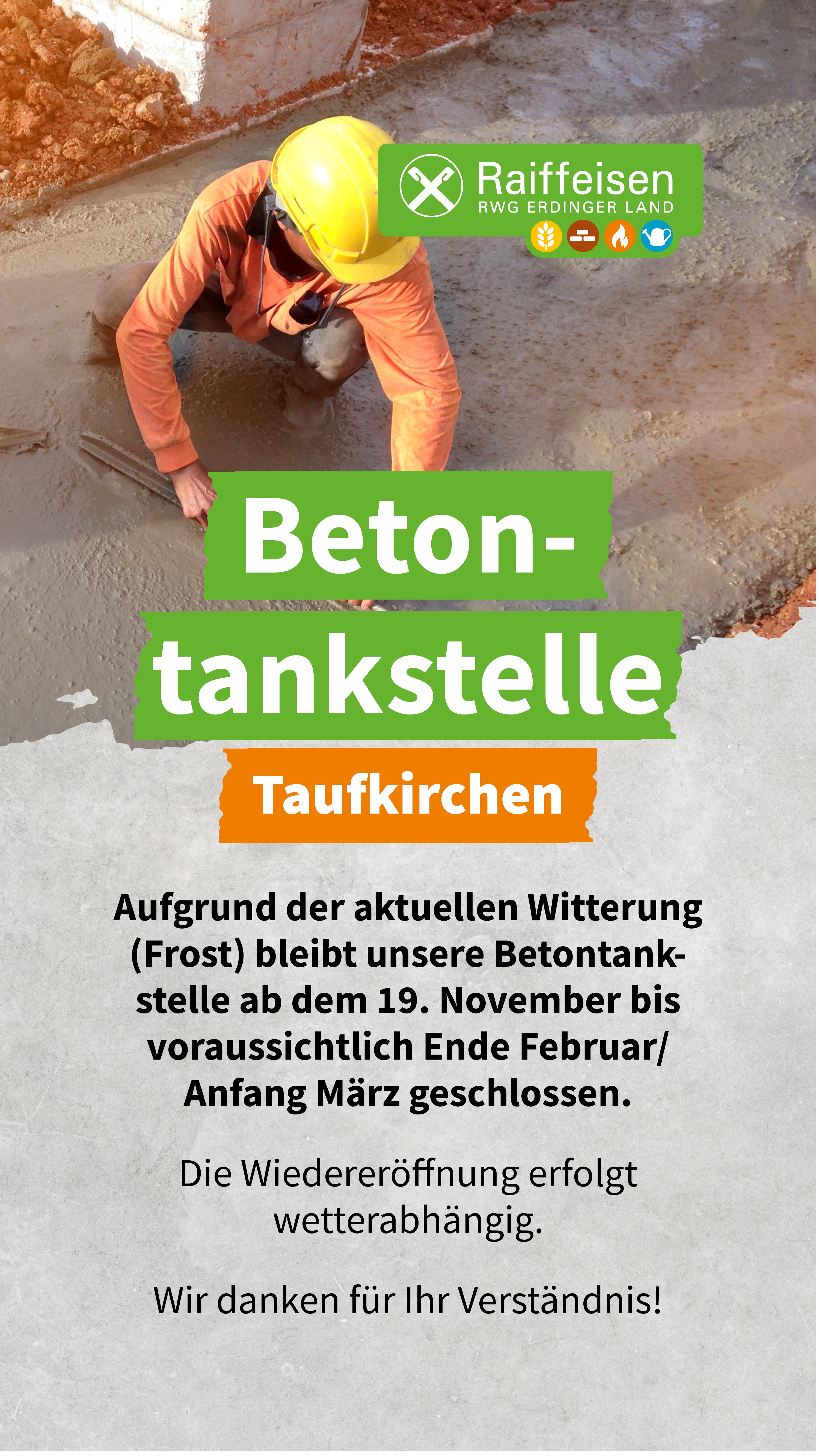 Betontankstelle RWG Taufkirchen: voraussichtlich bis Ende Februar/Anfang März geschlossen!