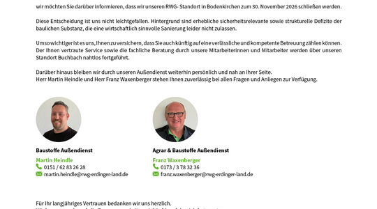 Schließung unseres RWG Standorts Bodenkirchen zum 30.11.2026